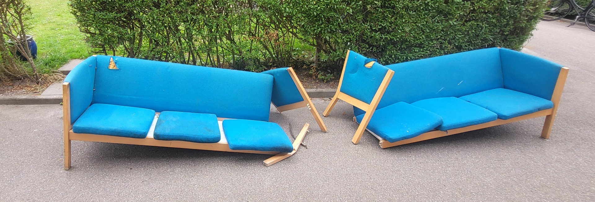 To 3er sofaer designet af Wegner, som var på vej i stort brændbart, da Kim faldt over dem. Han ville gerne selv have renoveret dem, men fandt til sidst opgaven for stor. Den enes "død" den andens brød. Vi købte dem af Kim for hvor ofte er det lige man for lov til at renovere en hel sofa???? gange to :-)